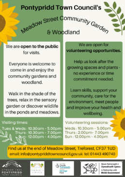 Meadow Street Community Garden and Woodland aims to engage with the residents of Pontypridd in activities that support health and wellbeing, by empowering people through knowledge, skills, and experiences. It is hoped that the space will inspire people to enjoy green spaces and nature, increasing their access and enjoyment of the local environment.